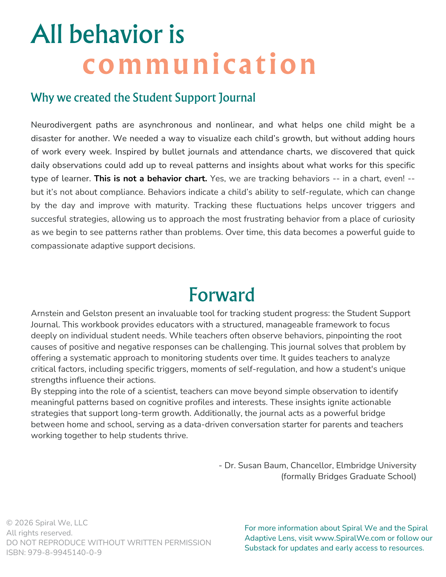 Grounded in developmental science and the Spiral Adaptive Lens, the journal supports professional judgment by helping educators understand how regulation, context, and strengths interact across time.